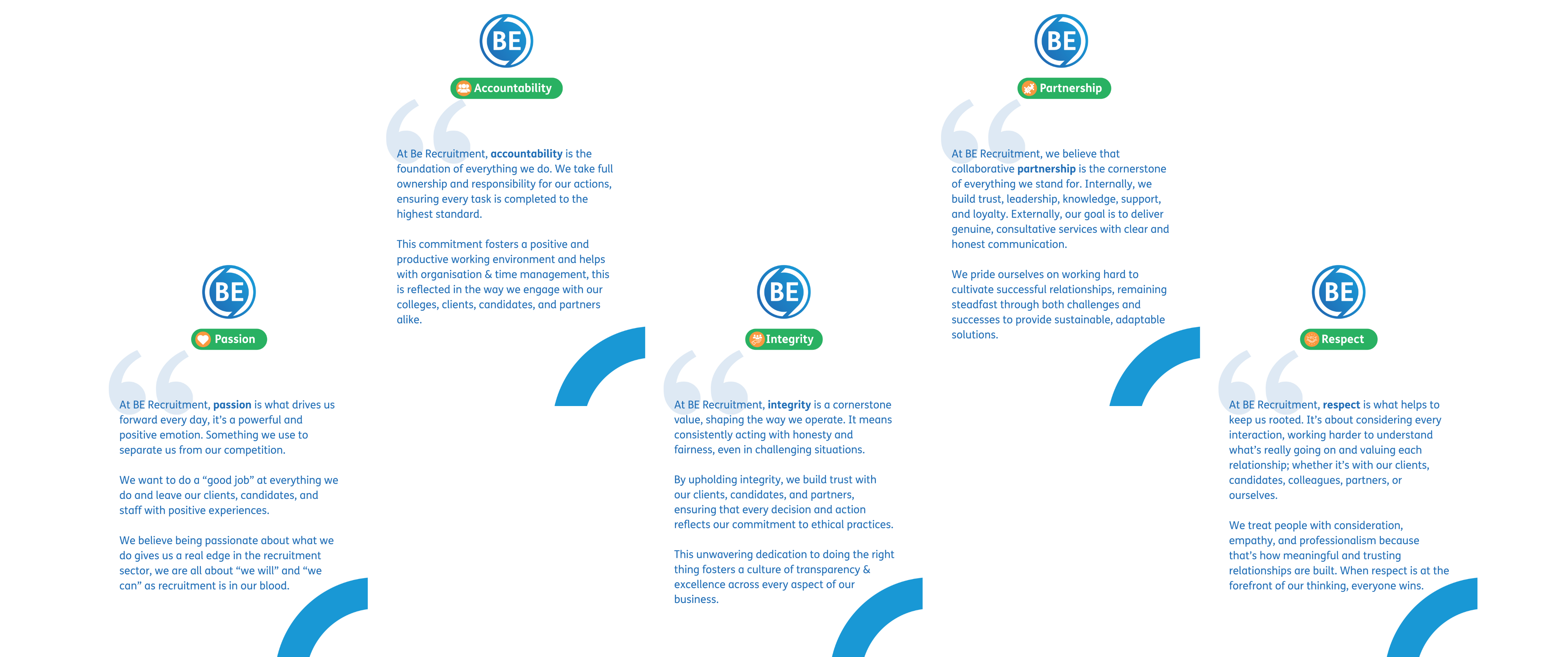 At BE Recruitment, integrity is a cornerstone value, shaping the way we operate and interact with all stakeholders. It means consistently acting with honesty and fairness, even in challenging situations.